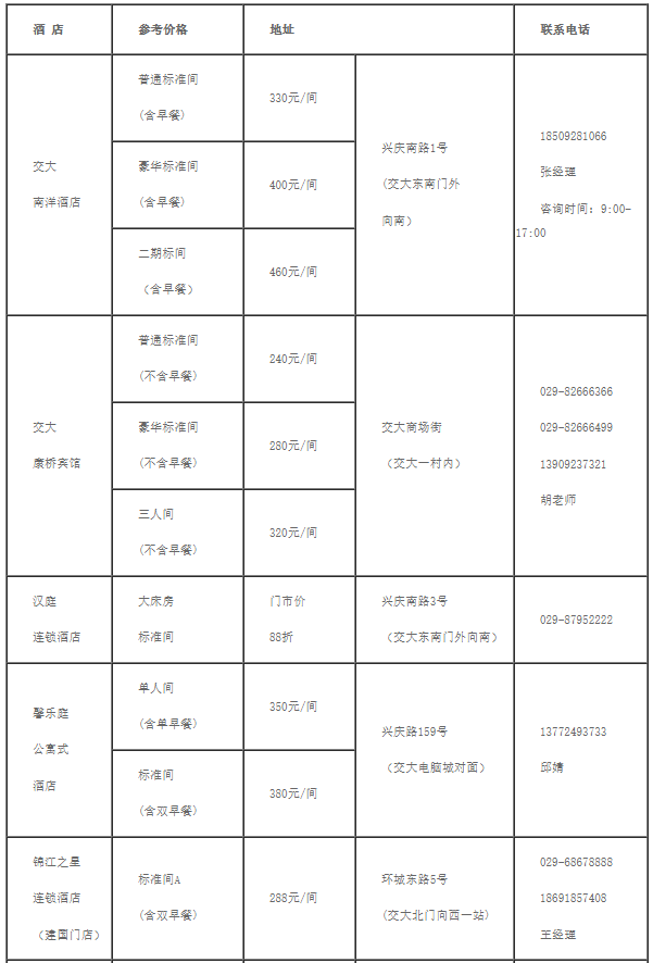 注:以上价格为我校与酒店的商定价格,请家长直接联系,我办不负责订房。