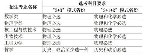 1.招生专业:数学类、物理学类、生物技术、哲学、核工程与核技术、工程力学。在非高考综合改革省份,哲学专业招收文科生,其他专业招收理科生。对实行高考综合改革省份的考生,选考科目须满足以下要求: